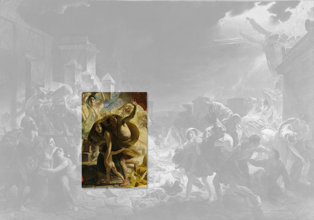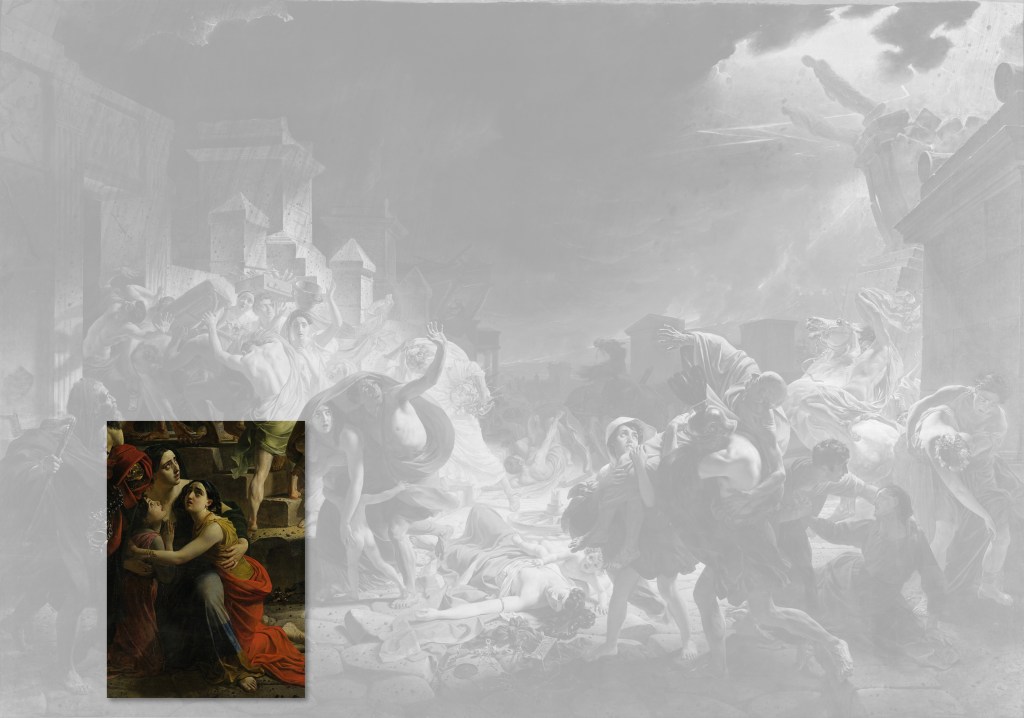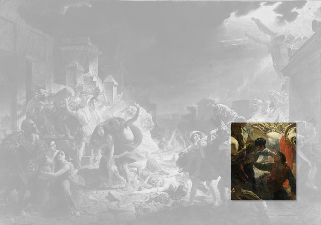 Ses personnages, malgré l’horreur de leur situation ne contiennent pas en eux-mêmes leur frayeur, provocant des frissons, comme le font les créatures sévères de Michel-Ange. Ils ne sont pas non plus possédés par ces sentiments à la fois insondables et subtils pour qui tout est accompli comme les sujets des toiles de Raphaël. Les personnages de Brioullov sont beaux malgré toute l’horreur devant laquelle ils sont placés. Ils sont absorbés dans leur beauté.