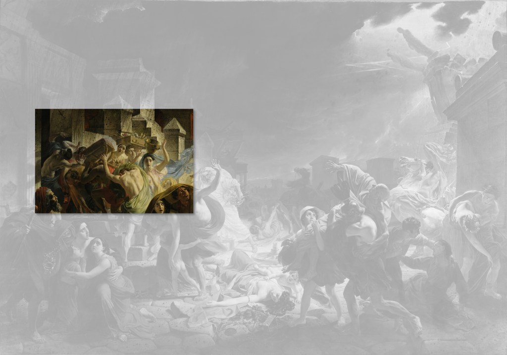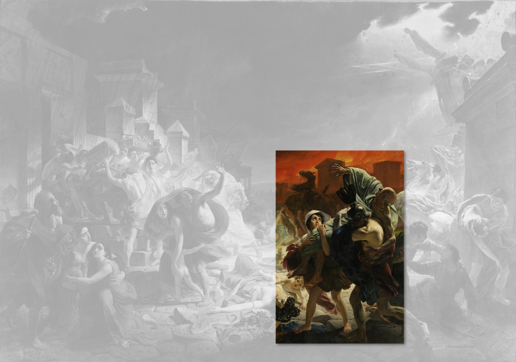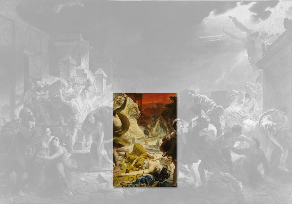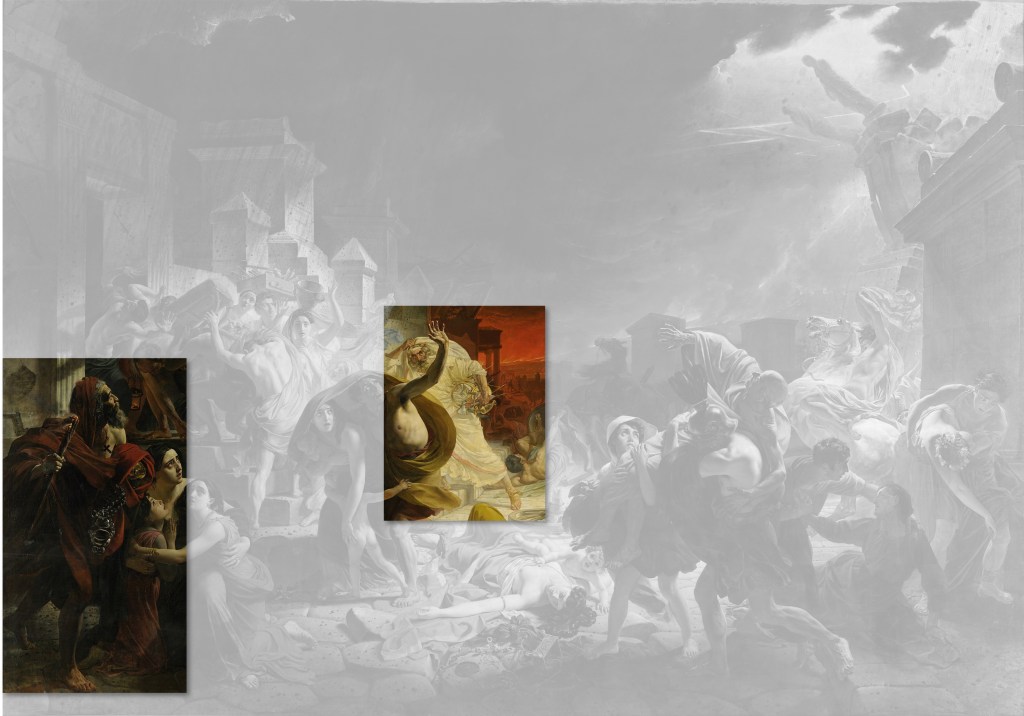 La très grande toile Le dernier jour de Pompéi (465,5 x 651 cm) est l’œuvre la plus célèbre du peintre russe Karl Brioullov. C’est en visitant le site de fouilles en 1827 que lui vient l’idée de peindre le tragique destin de cette petite ville et de ses habitants. Le prince Anatole Demidov, qu’il a rencontré à Naples, est alors prêt à acquérir l’œuvre. Brioulov commence donc à réaliser quelques esquisses. Le frère de Karl, Alexandre Brioullov, avait déjà visiter les ruines de Pompéi dans les années 1820, et y avait même réalisés des mesures et des croquis. Il n’a sans doute pas été étranger à l’envie de Karl d’également aller visiter cet endroit.