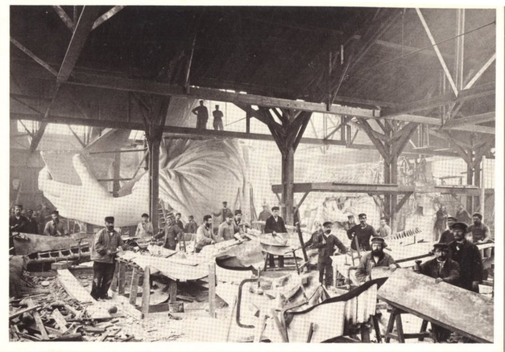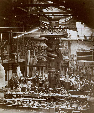 Viollet-le-Duc tombe malade et meurt en 1879. Bartholdi le remplace alors par l’ingénieur Gustave Eiffel. L’atelier Monduit, devenu entretemps la fonderie Gaget-Gauthier & Cie, fabrique les 300 feuilles de cuivre, d’un mètre sur trois, destinées à recouvrir la structure métallique. Peu à peu, les Parisiens voient s’élever la statue au-dessus des toits de a rue de Chazelles. L’endroit devient un lieu de curiosité.
